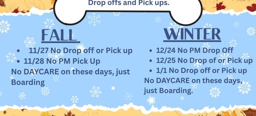 While we take care of your pets 365 days a year, we do observe holidays. We will NOT be open for Dog Boarding drop-offs or pick-ups on the following holidays: